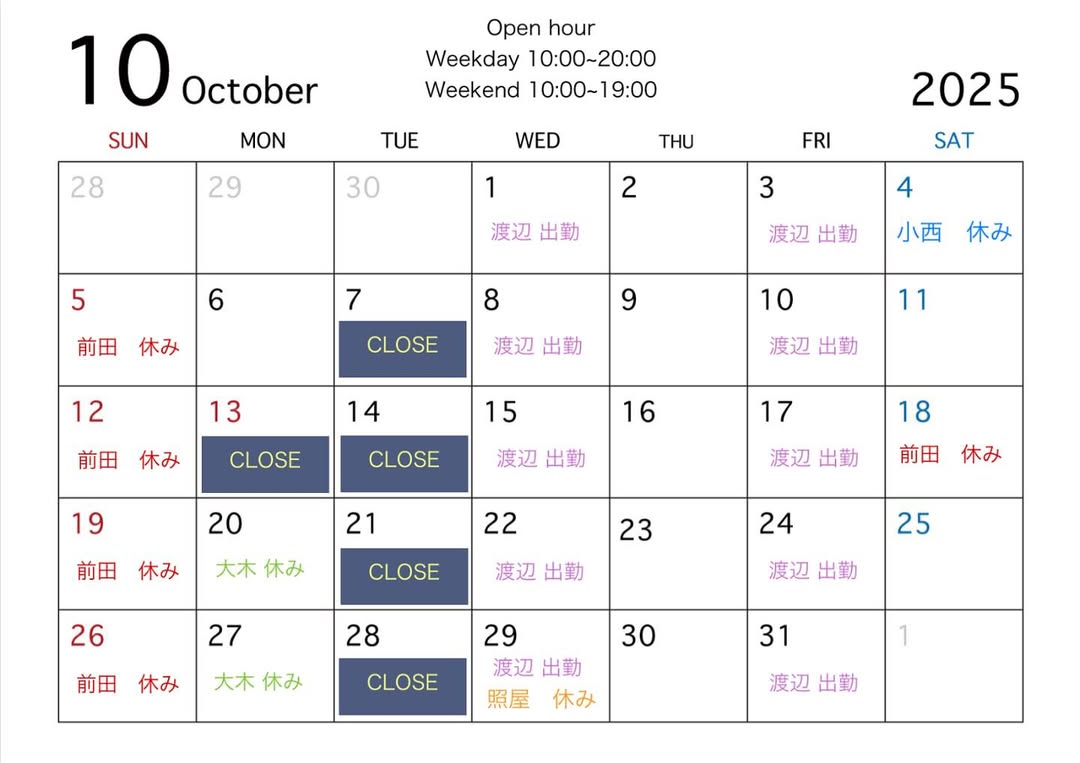 7(火)13(月)14(火)21(火)28(火)29(水)